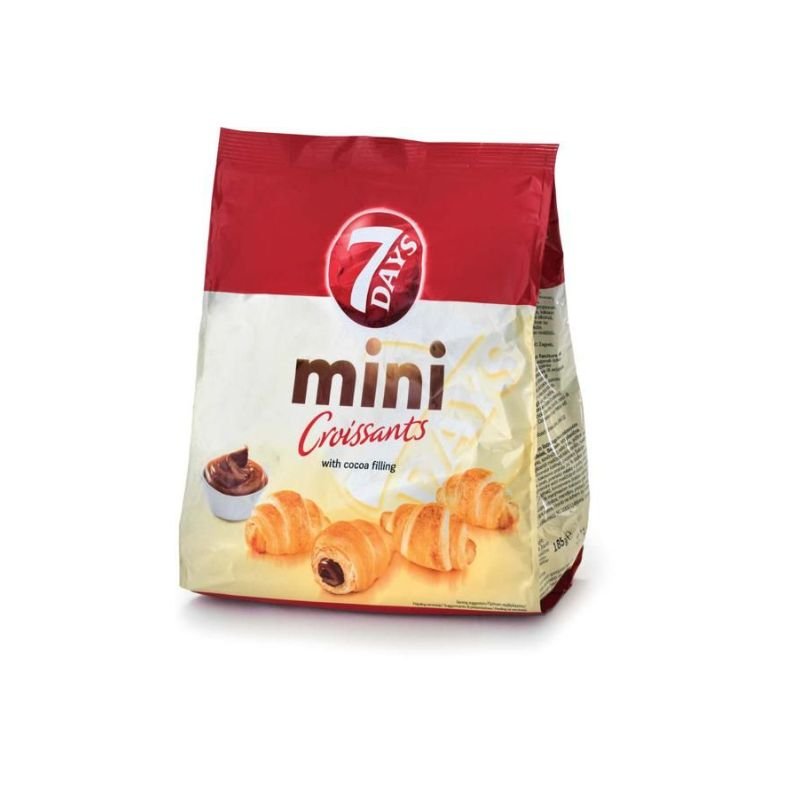 7 DAYS MINI ROGLJIČEK KAKAO 185G Mini rogljički s kakavovim nadevom (34%) – Sestavine: Testo: PŠENI