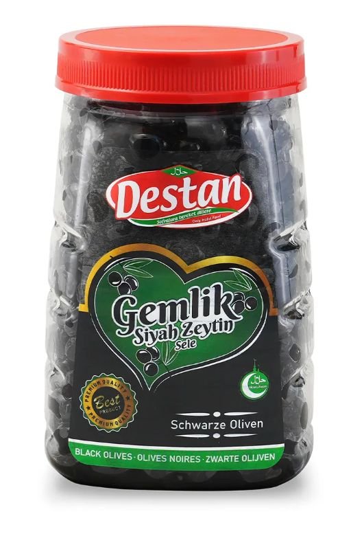 DESTAN GEMLIK ČRNE OLIVE 1200G Črne Olive V Slanici – Sestavine: Črne olive s koščico, sol, koruzno