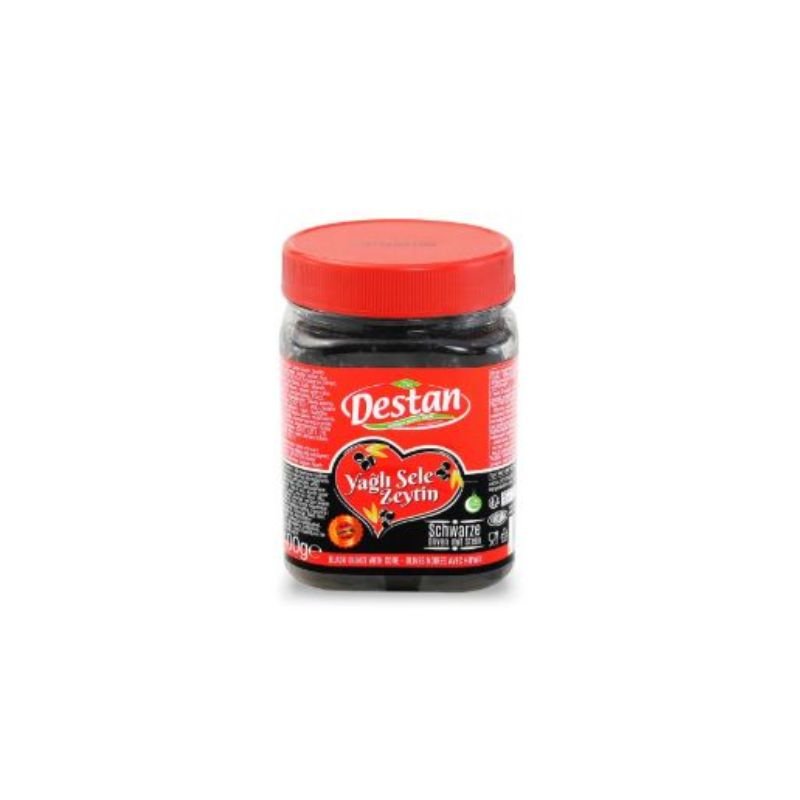 DESTAN YAGLI SELE ČRNE OLIVE 400G Črne Olive V Slanici – Sestavine: Črne olive s koščico, sol, koru