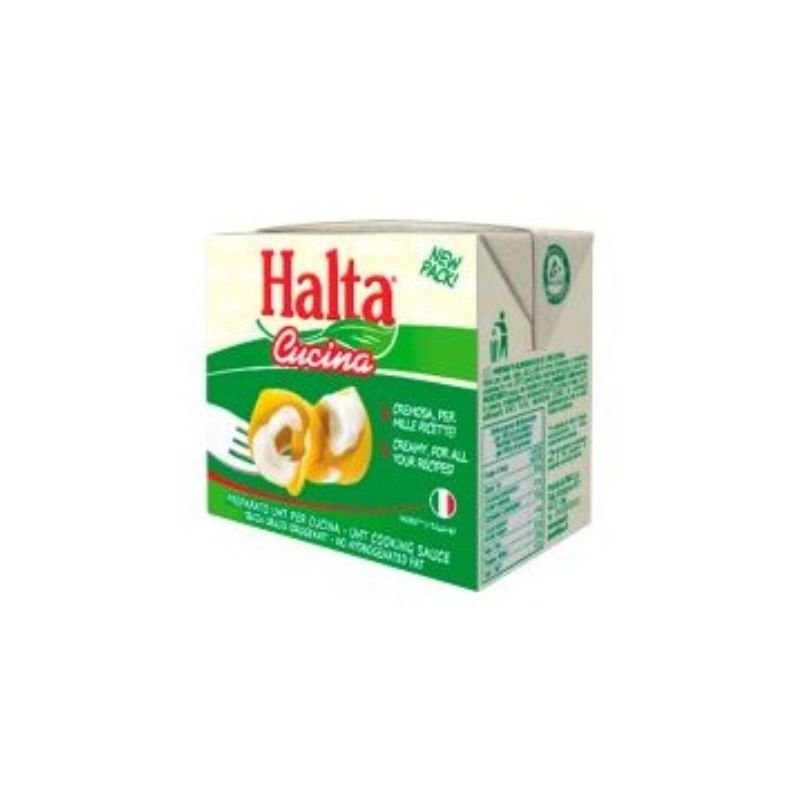 HALTA OMAKA ZA KUHANJE 500ML. Neto: 500ml. Smetana za kuhanje – SESTAVINE: voda, rastlinska olja sončnice, SOJE in palmovo (v spremenljivih deležih), pinjenec in posneto MLEKO v prahu, maltodekstrini, emulgatorji (E472e, SOJIN lecitin, E471), gostila (