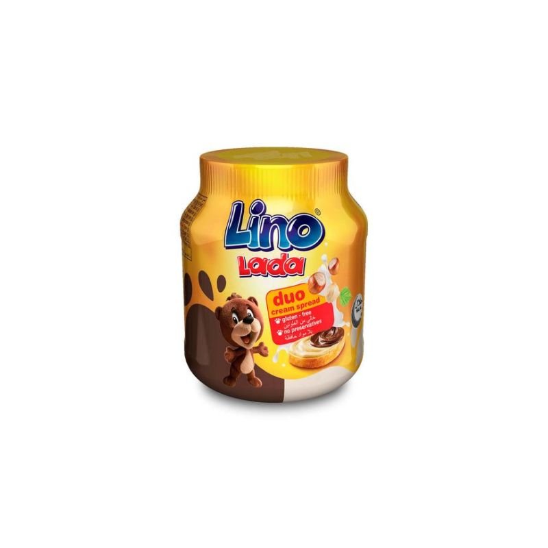 LINO LADA DUO 350G Mlečno-Lešnikova Krema. Brez Glutena. Sestavine: sladkor, sončnično olje, LEŠNIKI (10%), polnomastno MLEKO v prahu (9%), palmova maščoba, sladka SIROTKA v prahu, posneto MLEKO v prahu (4%), teksaški kakav v prahu (3%), dekstroza, Emulg