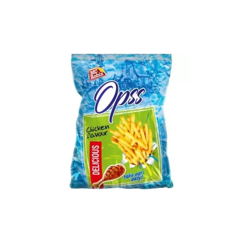 MC ROBIN OPS CHICKEN 90G Čips z okusom piščanca. Sestavine: pšenična moka 45 %, koruzna moka 8,9 %, palmovo olje 35 %, sladkor 3,2 %, sredstvo za povečanje prostornine – kalcijev karbonat 1 %, aroma piščanca 7 % (sol, maltodekstrin, koruzni škrob, ojačev
