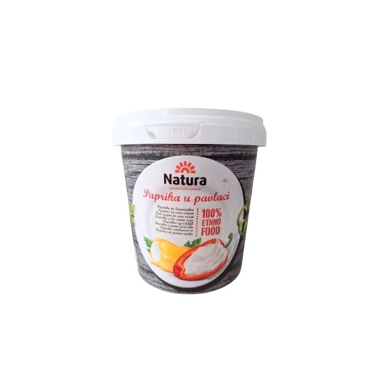 NATURA PAPRIKA V KISLI SMETANI 700G Paprika v kisli smetani (22%, mast) Sestavine: feferon cela 55%; KISLA SMETANA 45%, iz pasteriziranega MLEKA, kuhinjska sol, (konservans: kalijev sorbat). Hranite v hladilniku +4C – +8C. Po odprtju hranite v hladilniku