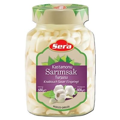 SERA VLOŽEN ČESEN 340G Pikantno-kislo vložen česen – Sestavine: česen, voda, sol, sredstvo za urav